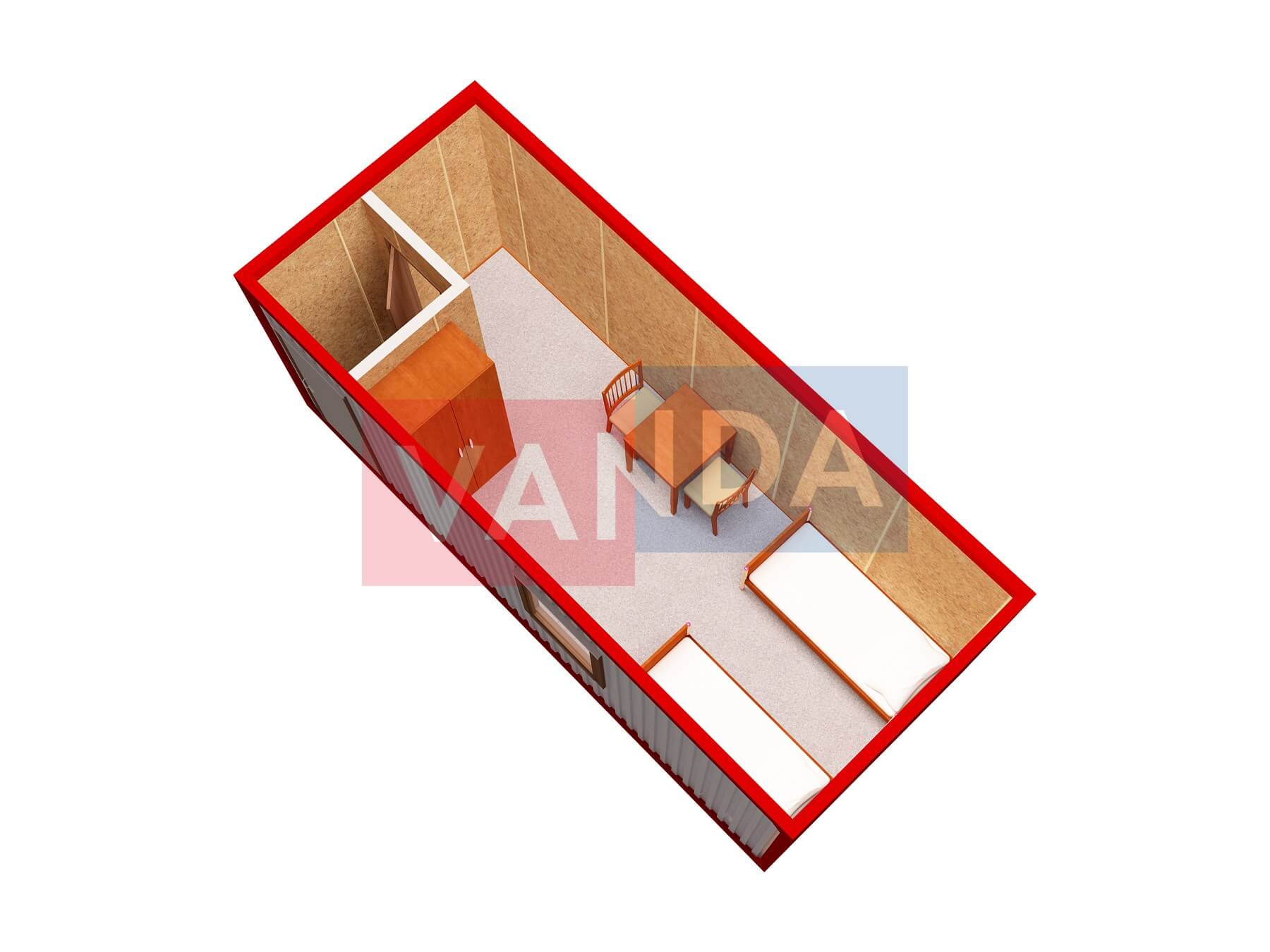 Бытовка металлическая утепленная №3 (вариант 1) изготавливается из несущего каркаса (верхняя и нижняя обвязка): швеллер 120х50х3 мм., угловые стойки: сложно - гнутый угол 90х90х3 мм., крыша блок-контейнера: металл сварной 0,9-1 мм., качественная наружная отделка: оцинкованный профлист, внутренняя отделка стен: Оргалит-ДВП, внутренняя отделка потолка: Оргалит-ДВП, вспомогательный деревянный каркас (стены): брусок 40х75 мм., лаги пола: обрезная доска 40х100 мм., лаги потолка: обрезная доска 40х100 мм., выполнено утепление: Минеральная вата «ISOVER» – 50 мм. и пароизоляция: плёнка техническая, черновой пол состоит из: обрезная доска 20 мм. (2 сорт), чистовой пол покрыт: ДСП строительное 16 мм., отделка пола выполнена из качественных материалов. Контейнер комплектуется окнами: деревянное, двойное остекление 800х1000, входной дверью: ДГ 21-8 обшита снаружи оцинкованным листом, врезной замок и внутренними дверями: ДГ 21-8 (при наличии перегородки). Если в БК присутствуют перегородки, то для них используется: брусок 40х50 мм.